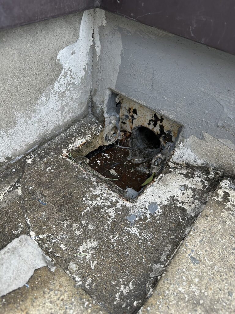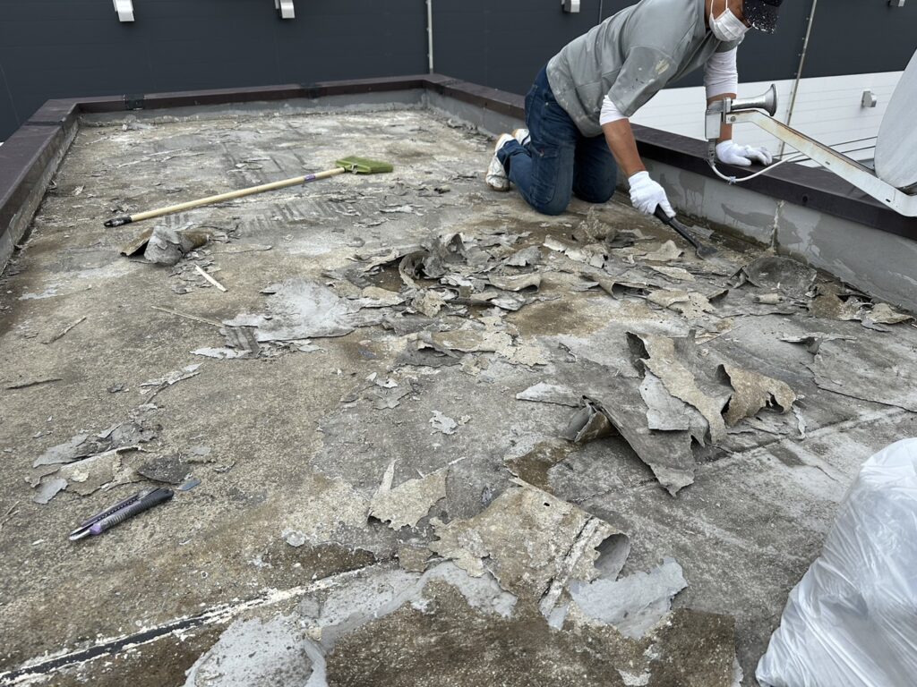 まずは既存の状況を確認しながら、古くなった防水をはがしていきます。